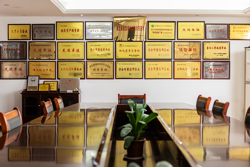 “明邦”商標被認定為“湖北省著名商標”,同時被評定為“湖北名牌”產品,企業同時被評定為“湖北省重合同守信用企業”、“湖北省新型墻材產業化示范基地”和“荊門市循環經濟示范企業”,公司通過了“綠色建材評價標識證書”、“GB/T 45001-2020職業健康安全管理體系認證證書”、“GB/T 19001-2016質量管理體系認證”、“GB/T 24001-2016環境管理體系認證證書”。